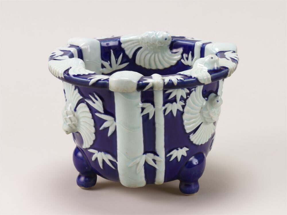 - Cobalt-Blue-Glazed Pot with Sparrows and Bamboo