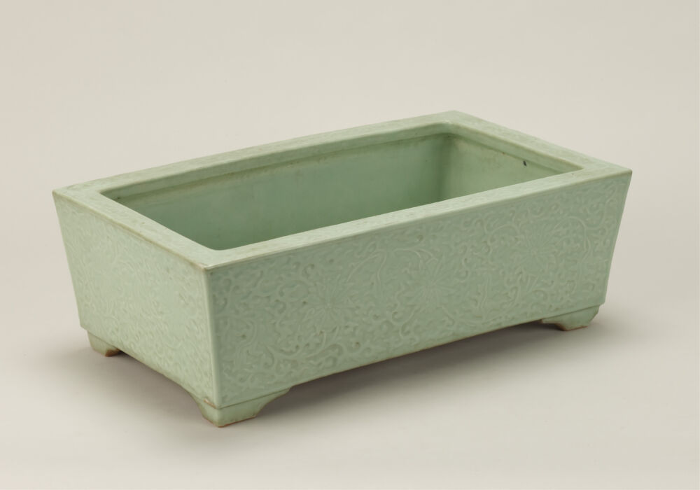 About Bonsai Current exhibit Bonsai Bonsai PotsSuiseki StonesTablesPaintingsHistory and Folklore Title: Rectangular Celadon Pot with Cotton Rose Arabesque Artist, etc: Unknown (China) Date: 20th c. Size: D:28.7cm x W:48cm x H:16.5cm Number: B-005