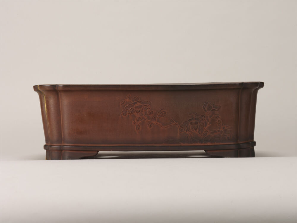This piece features a deep reddish-brown body adorned with relief carvings depicting chrysanthemum blossoms and birds perched on bare branches. The base bears the inscription “Tenkokaku,” suggesting it was likely used in the residence of a person of high status.