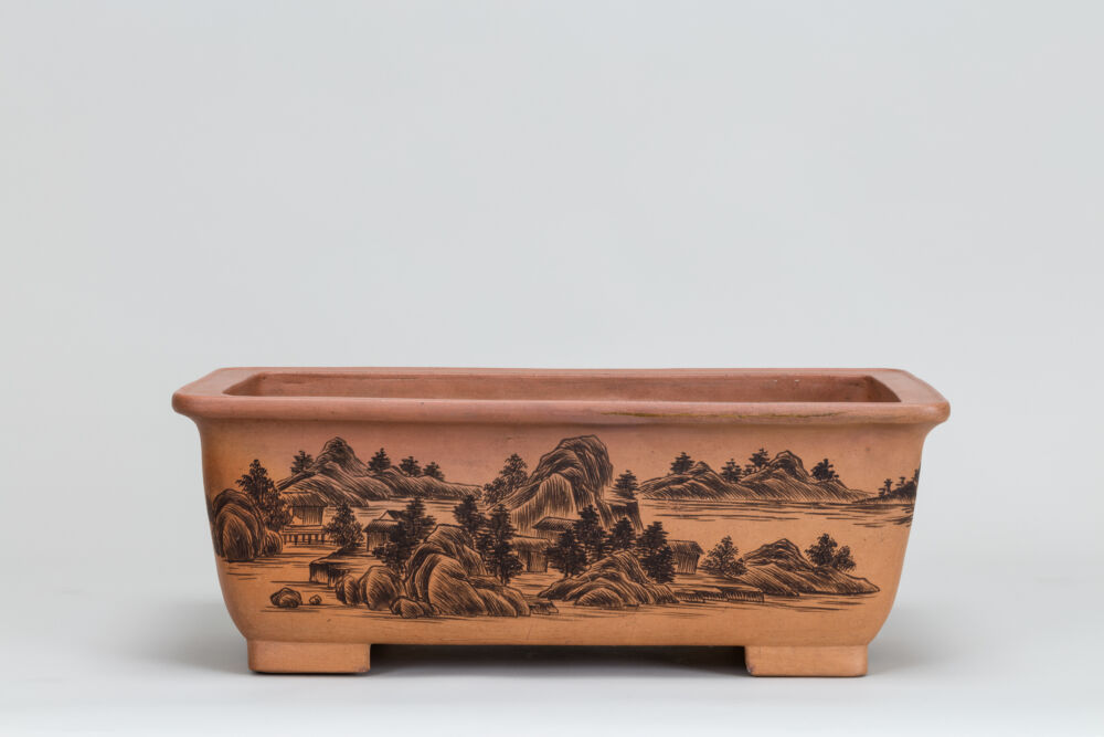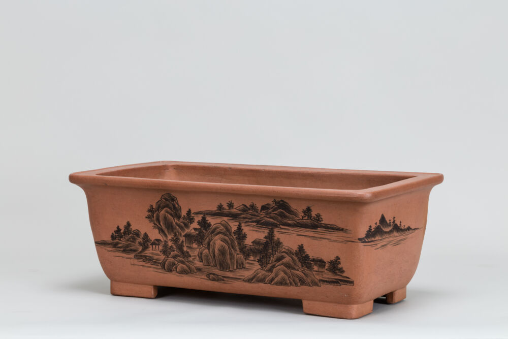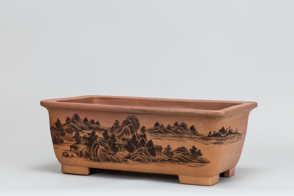 About Bonsai Current exhibit Bonsai Bonsai PotStoneTablePaintingsHistory and Folklore Title: Rectangular Peach-Blossom-Clay Pot with Design Artist, etc: Unknown (China) Date: Size: D:38.2cm x W:68.3cm x H:24.8cm Number: B-328