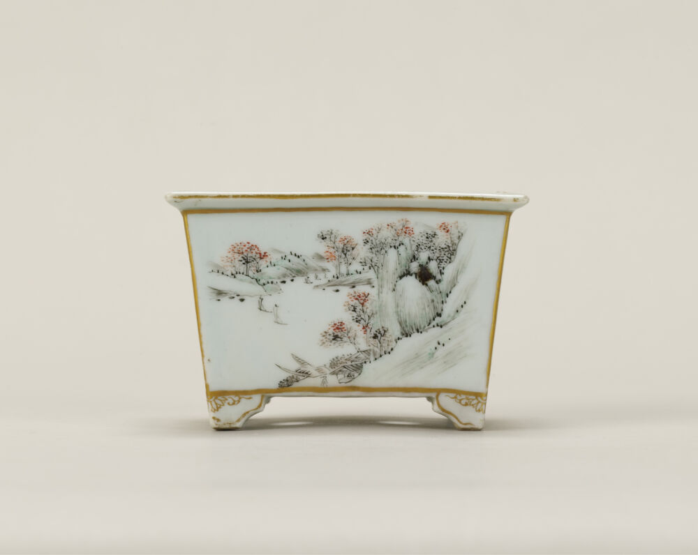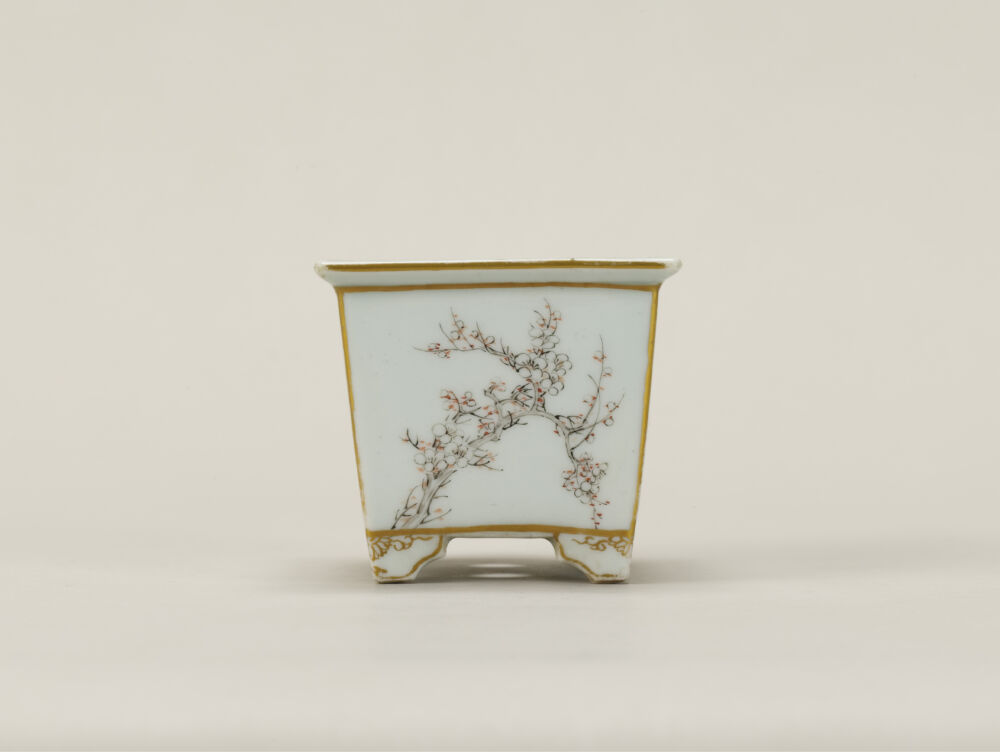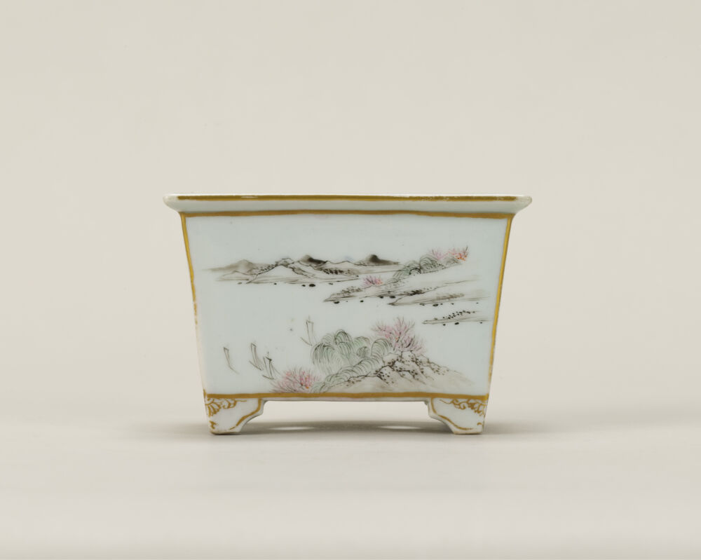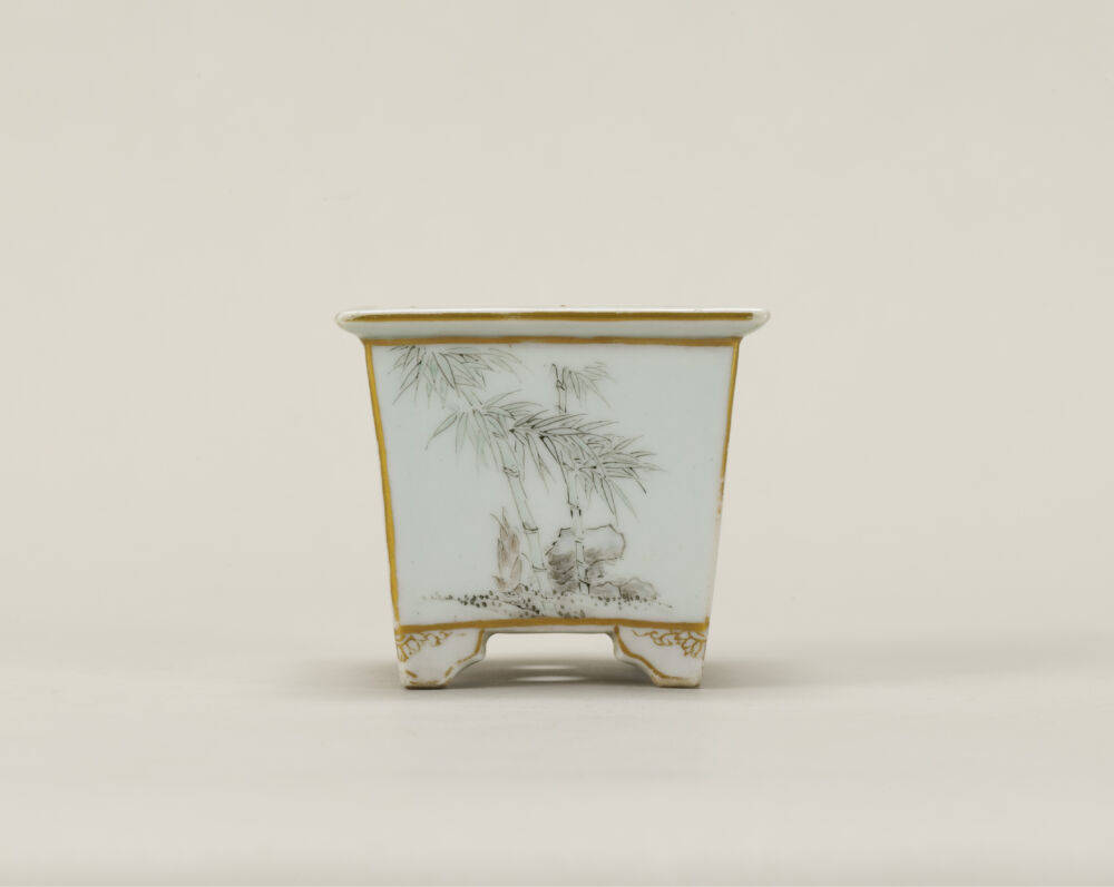 About Bonsai Current exhibit Bonsai Bonsai PotStoneTablePaintingsHistory and Folklore Title: Enameled Pot with Landscape and Shochikubai Design Artist, etc: Kanzan Denshichi Date: Size: Number: B-338