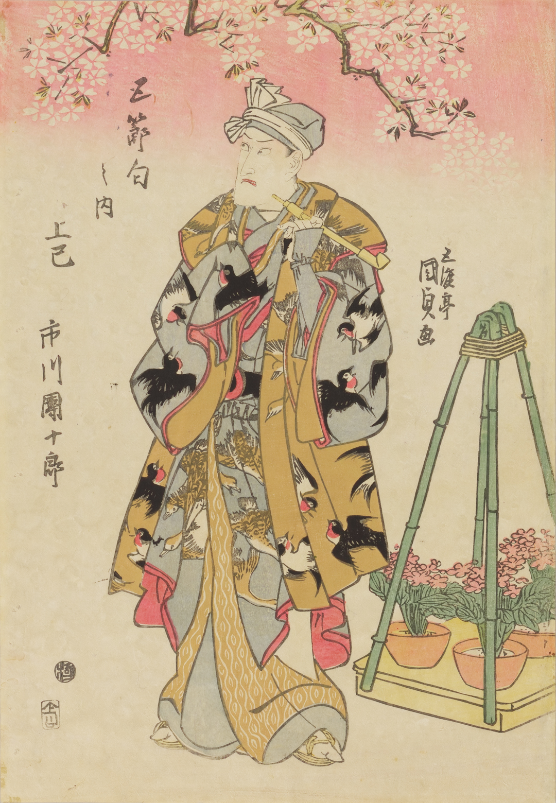 The Jōshi no Sekku is held on March 3 of the lunar calendar. It is also sometimes called the Peach Festival. This print depicts Ichikawa Danjuro VII, a kabuki actor who was very popular with women, standing next to a number of beautifully blooming primroses placed on a carrier.