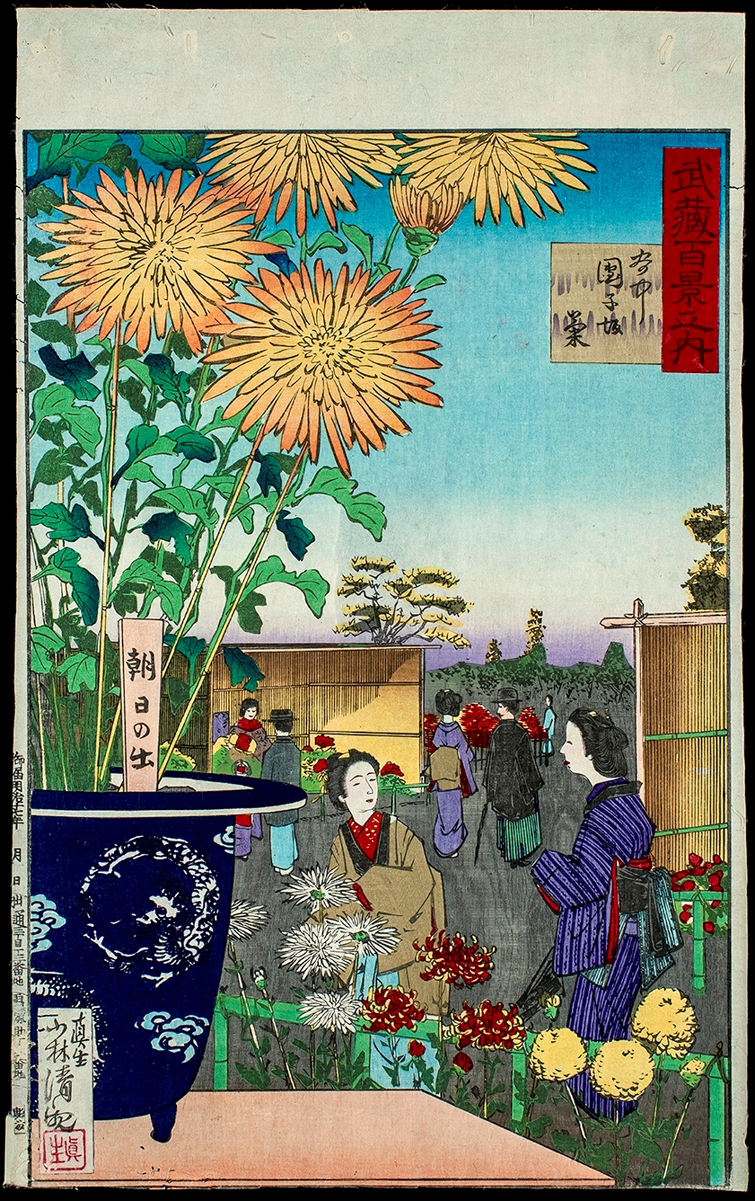 This is a picture of a gardener’s shop in the Dangozaka area of Yanaka, presently the Bunkyo Ward of Tokyo. You can see an example of the Asahi-no-de variety of chrysanthemum growing in a pot. In the background, a chrysanthemum doll can be seen. During the period, it was popular to create such life-sized figures using chrysanthemums. Dangozaka was the center of this fad during the Meiji period (1888~). The Asahi-no-de variety of chrysanthemum was popularly grown and sold during the Edo period.