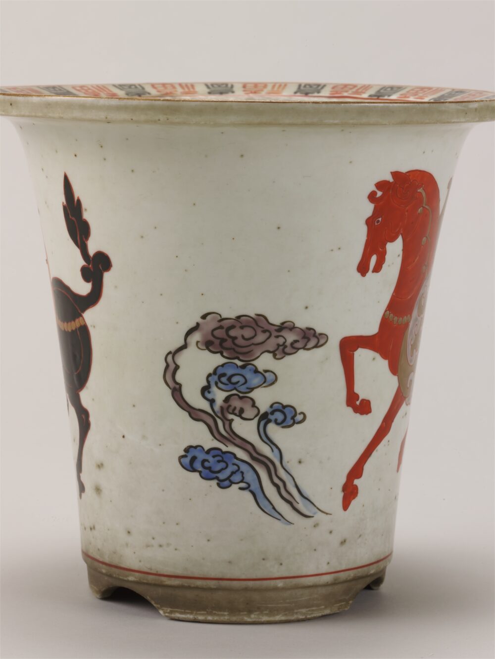 盆栽について 盆栽の展示一覧 盆栽 盆器水石卓絵画資料等歴史・民俗資料 名称 色絵天馬文丸鉢 作者等 不詳(日本) 制作年代 明治時代 寸法 幅:24cm x 高:22.8cm 資料番号 B-187 羽を持つ天馬の意匠は、ササン朝ペルシアから中国の唐王朝を経て、日本には白鳳時代に伝わった。本作の前脚を上げた天馬は、法隆寺に伝わった《龍首水瓶(りゅうしゅすいびょう)》の図像を写したもの。