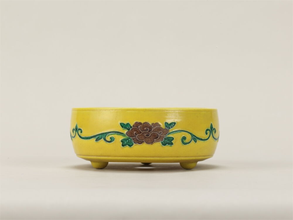 盆栽について 盆栽の展示一覧 盆栽 盆器水石卓絵画資料等歴史・民俗資料 名称 黄交趾丸鉢 作者等 永楽得全 制作年代 寸法 奥:15.2cm x 幅:15.2cm x 高:6.1cm 資料番号 B-247