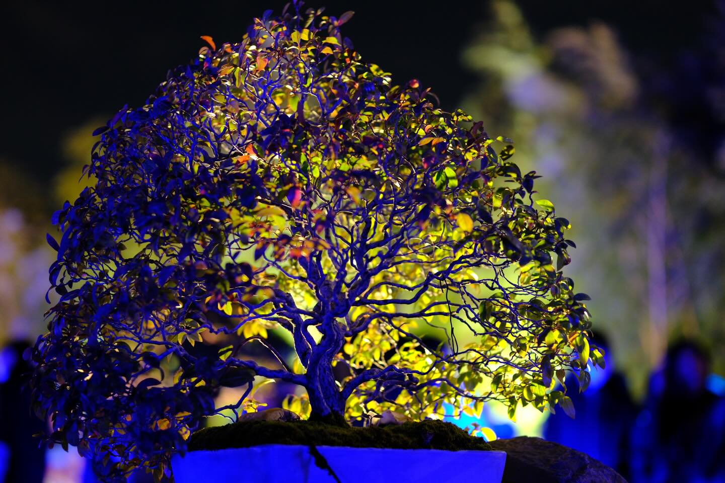 1日2回(18時、19時)、ライトアップされた盆栽をスモークの中に浮かび上がらせ、「BONSAI CANVAS」の世界を演出しました。