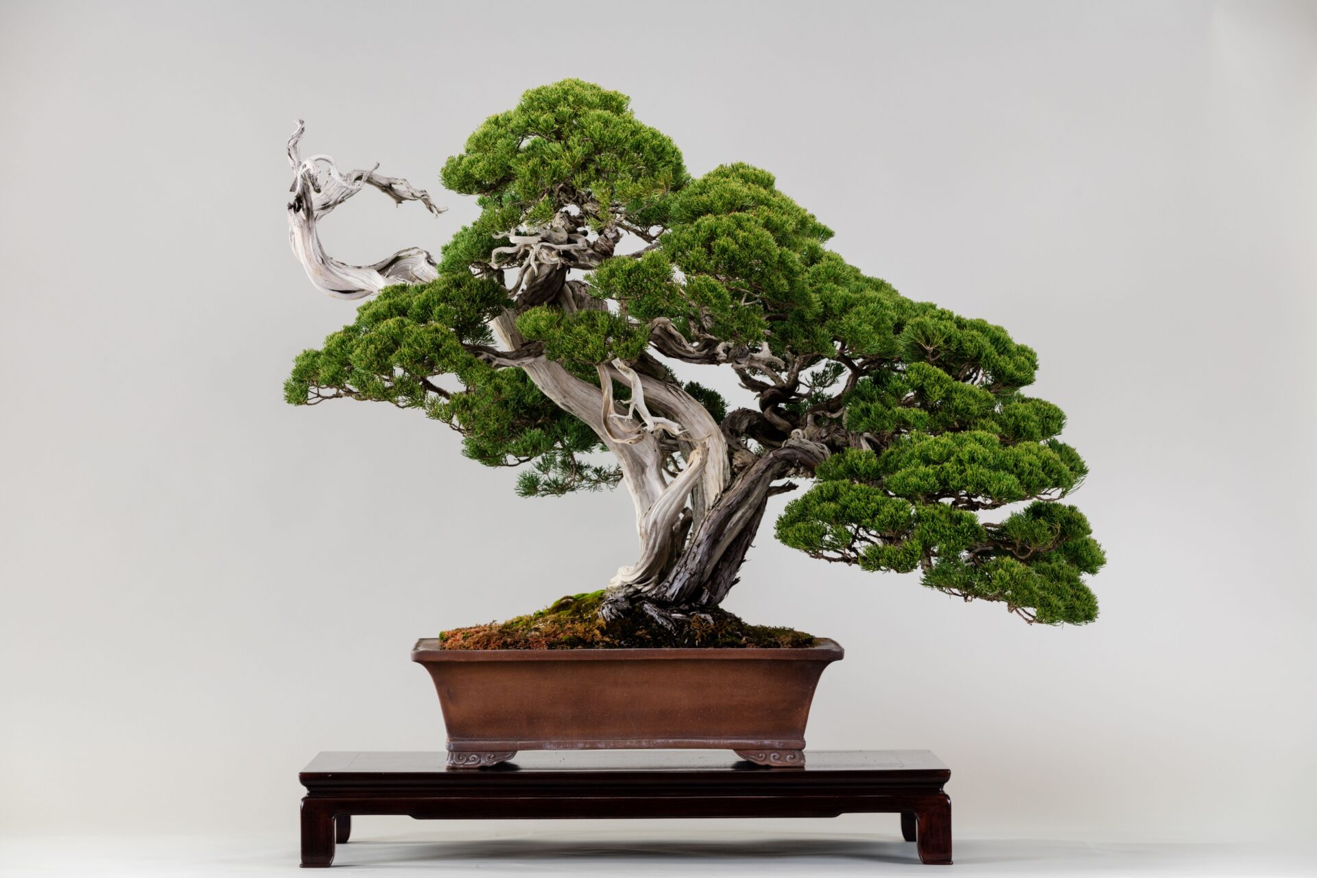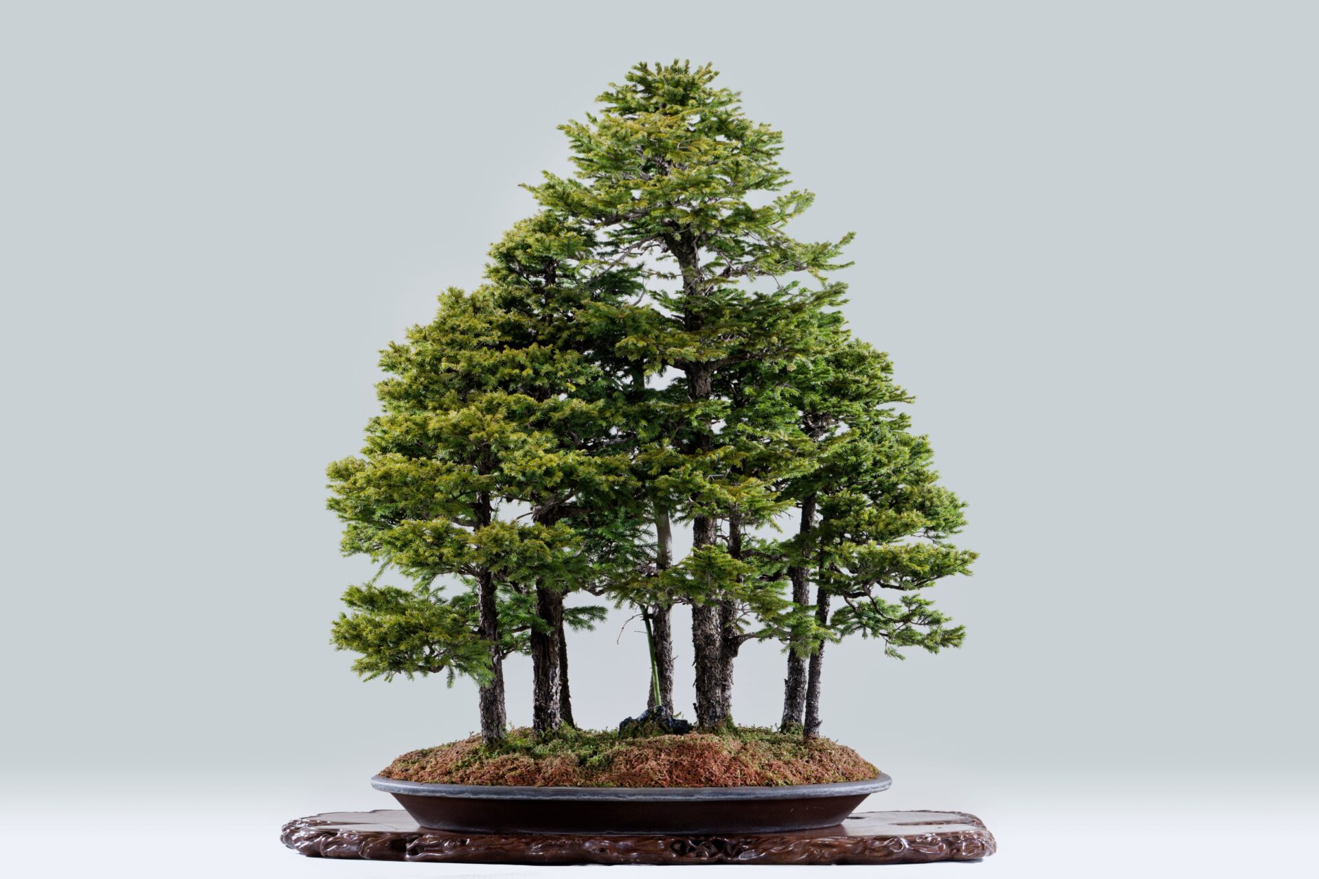 大型の鉢に何本もの蝦夷松が寄せ植えされた本作は、蝦夷松の原生林を想像させる。