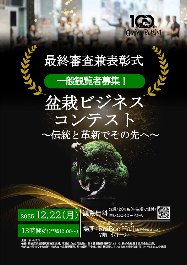 さいたま市では、世界に誇る「大宮盆栽」の文化を100年後の未来へ継承するため、次世代に向けた新たな価値創出を目指すビジネスプランを募集しました。