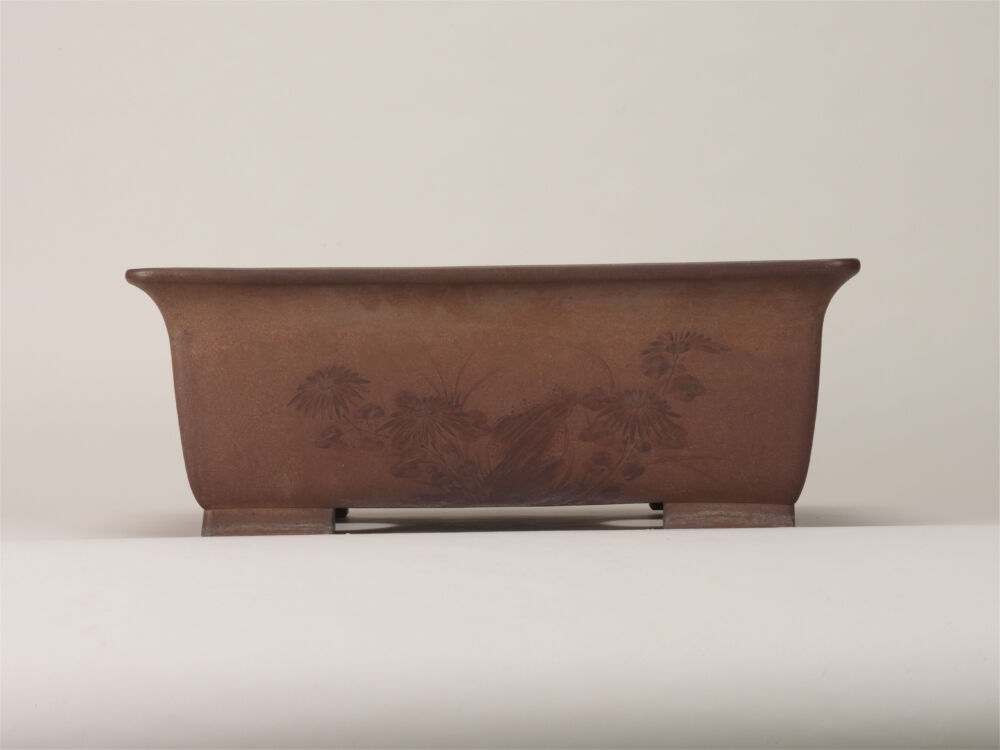 분재에 대해 분재 전시 목록 분재 분재 냄비수석광주회화 자료 등역사와 민속 이름 紫泥花鳥文長方鉢 저자 등 宜興窯 제작 연대 清時代 치수 자료 번호 B-099 紫泥の肌の上に、黒い土を筆で塗りつけ、正面には岩と梅と笹と三羽の小禽、背面には菊の花をあらわす。荒々しくも適確な筆づかいが、作者の優れた力量を物語っている。