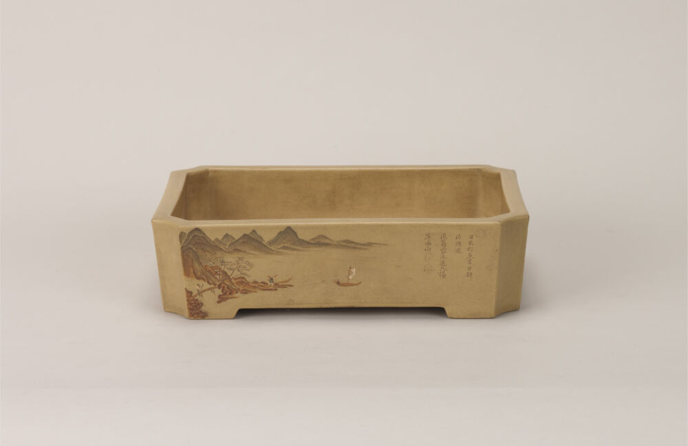 關於盆景 盆景展覽清單 盆栽 盆景鍋水石桌子繪畫材料等歷史與民俗 名稱 白泥山水図長方鉢 作者等 川石山人 生產年齡 尺寸 寬:31.4cm x 高:8.4cm 資料編號 B-139 用土中の鉄分含有量が少ないために、焼成した際にわずかに黄色みを帯びた白色となることから、「白泥」と呼ばれる泥物の鉢。本品の胴部前後面には、色泥による山水図が描かれており、それぞれ漢詩が線刻されている。底裏面に「川石山人」の陽文印があるが、人物については未詳である。