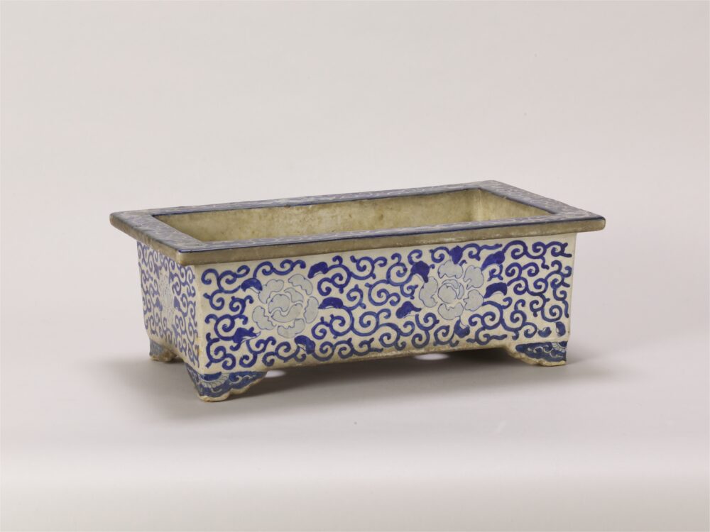關於盆景 盆景展覽清單 盆栽 盆景鍋水石桌子繪畫材料等歷史與民俗 名稱 染付花唐草文長方鉢 作者等 瀬戸焼 生產年齡 尺寸 深:25.2cm x 寬:40.7cm x 高:14.3cm 資料編號 B-174