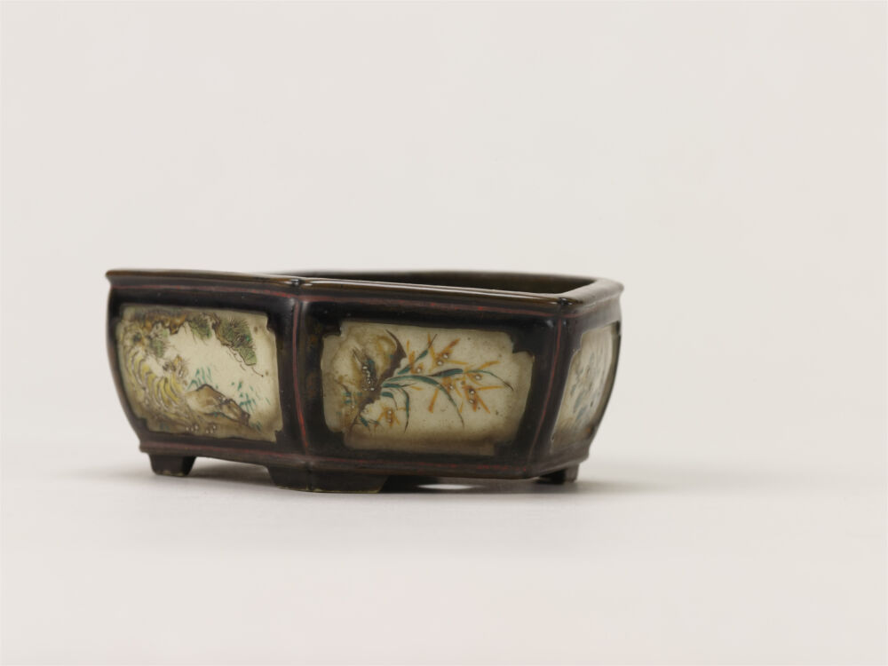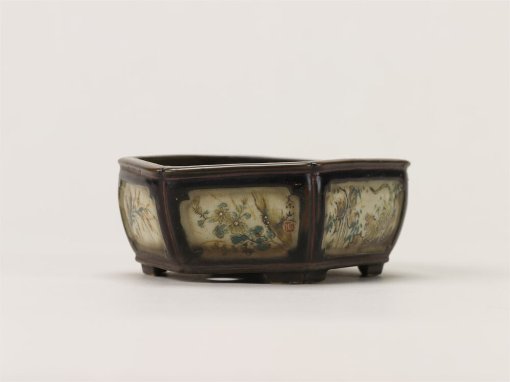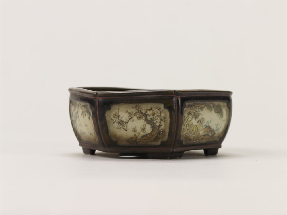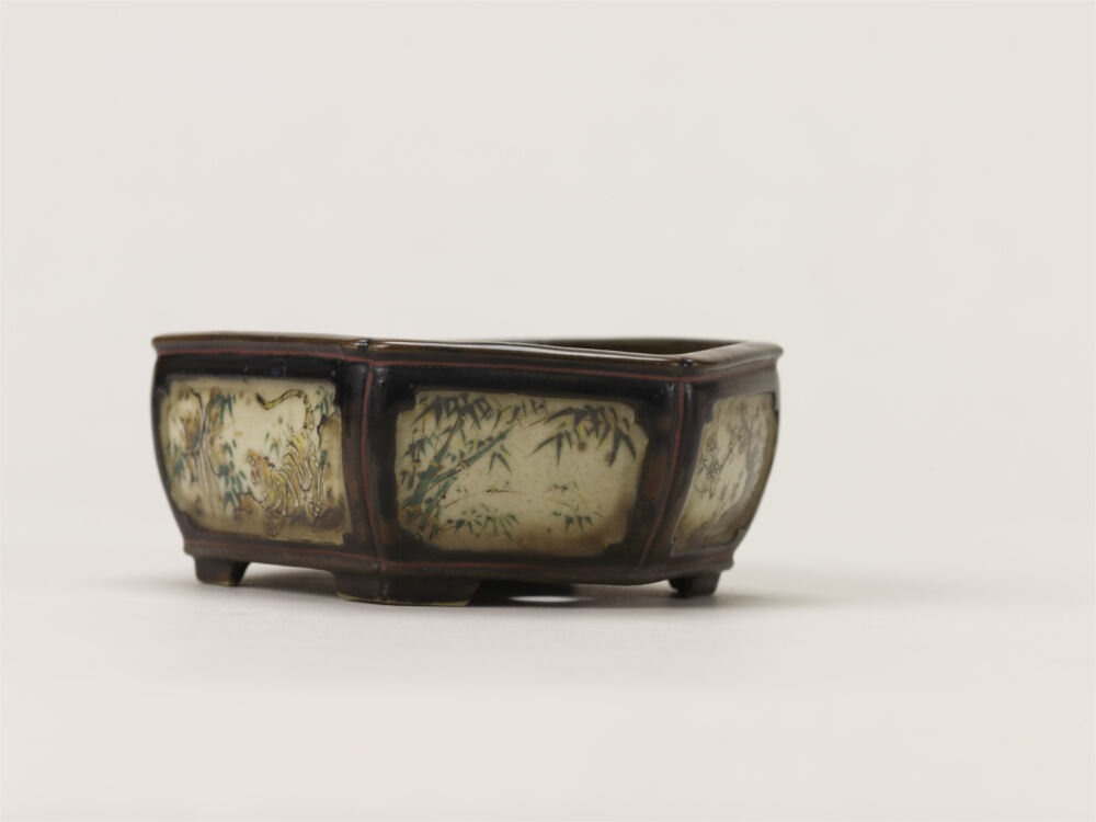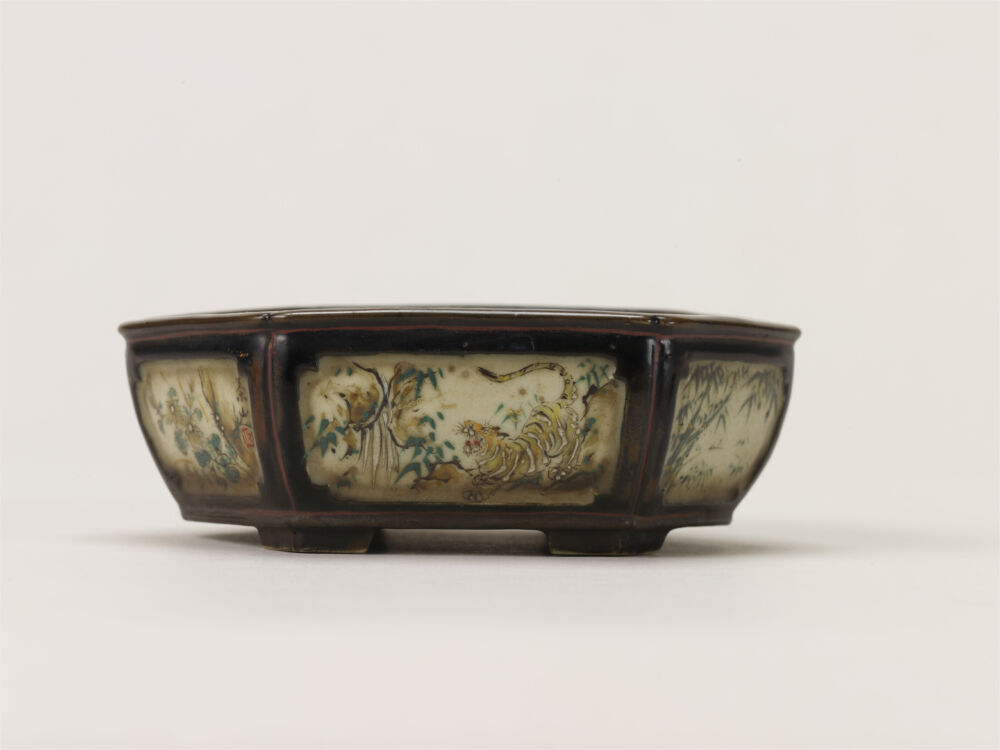 關於盆景 盆景展覽清單 盆栽 盆景鍋水石桌子繪畫材料等歷史與民俗 名稱 黒釉虎文六角鉢 作者等 茶山陶翠 生產年齡 昭和 尺寸 深:9.5cm x 寬:13.9cm x 高:4.6cm 資料編號 B-304